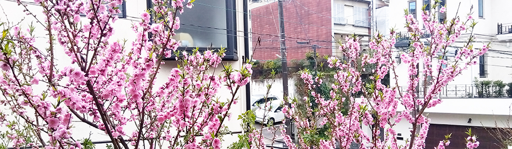 写真は 私の部屋から眺めた「お隣さんちの桃の花」。例年より満開になるのが遅い。
