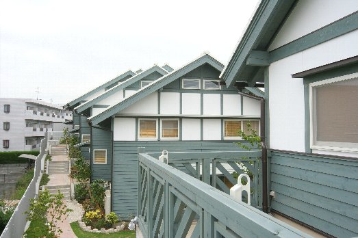 ■手前デッキの奥に見えるのが、メゾネットタイプの4戸を連ねた連棟。1戸ごと水平方向と垂直方向にずらして設計しています。そうすることで、連棟でありながら1戸建と変わらないアメニティを実現しています。