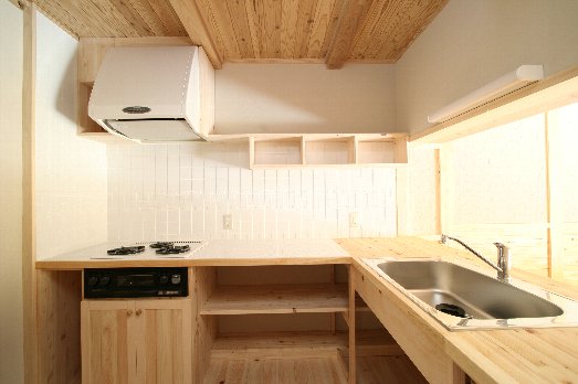 ■シンクとコンロ、コンロ周りの壁、換気扇以外は、すべて木造のキッチンです。