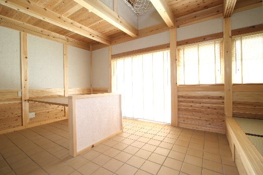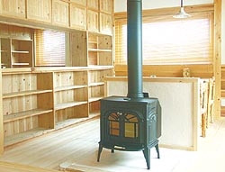 ■広すぎず、狭すぎず『適度なヒューマンサイズ』が自然素材生活の考えです。現在は、部屋の真ん中に薪ストーブが据付られています、2Fに吹き抜けているので家全体が温まります。小上がりの畳スペースで、ゆったりとくつろぐことができます。