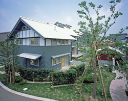 アンチックブルーの板壁と漆喰の外壁、深みのあるパールホワイト和瓦が、美しい家並みを作り出しています。パールホワイト和瓦は、厳しい夏の日差しの下でも、小屋裏温度を驚くほど抑えてくれます。省エネに対応するやさしい暮らしのシンボルです。
