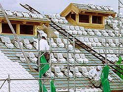 E棟を除いて、A棟、B棟、C棟そしてD棟の4棟すべての棟が上がりました。もっとも早く工事が進められたD棟は、すでに屋根の上に瓦がのりました。ここ「大針ビレッジ」にも「自然素材生活館・和合倶楽部」と同じパールホワイト和瓦が採用されています。パールホワイト和瓦は、その美しい外観だけでなく、厳しい日本の夏をできる限り機械力に頼らない住まい方を目指すうえで、大きな効果を発揮します。このことはすでに「和合倶楽部」で確かめられています。無垢のスギ野地板の上には厚さ50ミリの炭化コルクが敷き詰められ、その上をルーフィングシートが覆います。そして瓦桟の上に熟練の瓦職人によってパールホワイト和瓦が葺かれていきます。屋根の上には、美しく光る薪ストーブの煙突も見えますね。なんと「大針ビレッジ」には全部で5台の薪ストーブが設置されています。「大針ビレッジ」は四季それぞれに「人と自然が響き合うくらし」を楽しむための仕掛けやこだわりがたくさんあるのです。